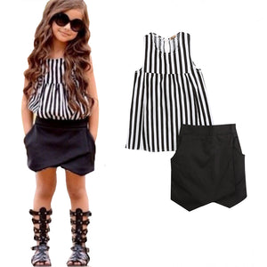 NEW Hot-selling 2pcs Baby Kids Girls Summer Clothes Sleeveless Striped Tops Blouse+Asymmetric Shorts Outfits Clothing Set 2~7T